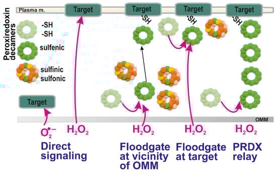 The local increases in H2O2 as an initiating event of redox signaling can be considered to act indirectly on target proteins through PRDXs according to the so-called floodgate model [2,113]. According to this model, scavenging PRDX enzymes are inactivated by H2O2 (oxidized to sulfinic and sulfonic moieties, see above). Therefore, only the remaining PRDXs existing in a sulfenic form may subsequently oxidize the passive or terminal target. Thus, for example, local increases in H2O2 may inhibit local peroxiredoxins and only a remote peroxiredoxin is capable to relay the redox signal to the target protein (Figure 2). Consequently, at higher H2O2 concentration (local) levels, if instead of sulfenic acid (R-SOH), higher oxidized states, sulfinic (RSO2H) moieties are formed, they may be regenerated i.e., reversed to sulfenic moieties by sulfiredoxin (SRX) enzyme. However, the reduction by SRX is much slower than that by TRX [114]. Moreover, when sulfonic (RSO3H) residues are formed, this is irreversible. As a result, their formation can be regarded as oxidative stress and not physiological redox signaling [115].