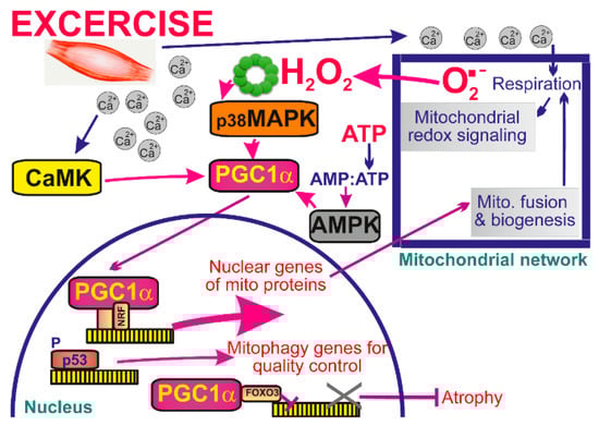Figure 4. Mitochondrial signaling in skeletal muscle during exercise. During exercise cytoplasmic Ca2+ concentration rises leading to activation of calcium-calmodulin-dependent kinase (CaMK) and increase in mitochondrial respiration, and subsequent increase in ATP and ROS production. While Ca2+ acts via CaMK, the AMP/ATP ratio stimulates the AMP-activated protein kinase (AMPK) pathway and mitochondrial ROS target the p38 mitogen-activated protein kinase pathway (MAPK). All signals are then integrated in the increase of transcriptional activity of the master regulator of mitochondrial biogenesis, peroxisome proliferator-activated receptor-gamma coactivator-1α (PGC1α).