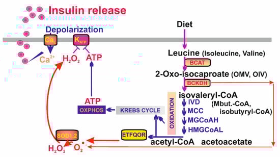 Figure 5. Mitochondrial redox signaling as essential part of branched-chain keto-acid- stimulated secretion of insulin. Branched-chain keto-acids are metabolized by a series of catabolic reactions leading to production of substrates fueling Kreb‘s cycle and the mitochondrial respiratory chain. ATP and H2O2 then cause closure of the ATP-dependent K+ channels (KATP) on the plasmatic membrane, membrane depolarization and activation of the voltage-gated Ca2+ channels (CaL) setting off the canonical pathway of insulin release. BCAT—branched-chain α-ketoacid amino transferase; BCKDH—branched-chain α-ketoacid dehydrogenase; IVD—isovaleryl-CoA dehydrogenase; MCC—methylcrotonyl-CoA carboxylase; MGCoAH—methyl-glutoconyl-CoA hydratase; HMGCoAL—3-hydroxy-3-methylglutaryl-CoA lyase.