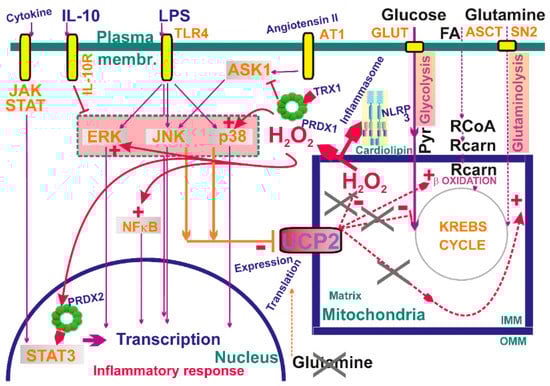 Figure 6. Examples of mitochondrial signaling upon activation of different kinases—schematic overview examples of established participation of mitochondria-generated H2O2 in signaling cascades. Also, a role of inhibition of UCP2 is outlined, resulting in elevation of mitochondrial superoxide generation and hence elevated H2O2 release. For a detailed explanation see Section 8 and Section 9.