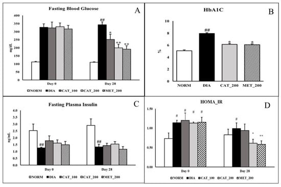 Effect of catalpol and metformin on FBG, plasma insulin, HbA1C and HOMA_IR index. (A) FBG at baseline (Day 0) and 28 days; (B) HbA1C on day 28; (C) Plasma insulin level; (D) HOMA_IR index. NORM: Normal control; DIA: Diabetic control; CAT_100: Catalpol (100 mg/kg, p.o.); CAT_200: Catalpol (200 mg/kg; p.o.); MET_200: Metformin (200 mg/kg, p.o.). Data were expressed in mean ± SEM (n = 8). # p < 0.05 and ## p < 0.01 vs. NORM; * p < 0.05 and ** p < 0.01 vs. DIA.
