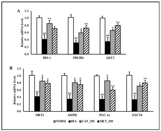 Insulin receptor substrate 1 (IRS-1), phosphatidylinositol 3-kinase regulatory subunit alpha (PIK3R1) and RAC-beta serine/threonine-protein kinase (Akt2) gene expression was determined in skeletal muscle of all the animals. The transcript expression of IRS-1, PIK3R1 and Akt2 were significantly (p < 0.01) down-regulated in the skeletal muscles of diabetic mice compared to normal control. Administration of catalpol (200 mg/kg) and metformin (200 mg/kg) reversed the reduction and their mRNA levels were significantly (p < 0.01) higher than diabetic control (Figure 3A). In addition to insulin signaling pathway, gene expression of 5′ adenosine monophosphate-activated protein kinase (AMPK) was investigated in order to validate the results with mitochondrial function study. Peroxisome proliferator-activated receptor gamma coactivator 1-alpha (PGC-1α), sirtuin 1 (SIRT1), AMPK, and glucose transporter type 4 (GLUT4) were significantly (p < 0.01) down-regulated in the diabetic skeletal muscles. Catalpol (200 mg/kg) and metformin (200 mg/kg) treated animals showed profound (p < 0.01) improvement in SIRT1, PGC-1α, AMPK, and GLUT4 expression in the skeletal muscle as compared to diabetic control. The transcript level of PGC-1α, which is co-regulated by SIRT1 and AMPK, were normalized by catalpol treatment and to a lesser extent in the metformin group. Consequently, skeletal muscle expression of GLUT4 was rescued in both the treatment groups (Figure 3B).