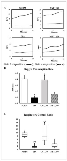 Effect of catalpol on state-3/stae-4 respiration, oxygen consumption rate (OCR) and respiratory exchange rate (RCR) (A) Representative trace of oxygen consumption shown by relative fluorescent units (RFU) over time between 0 and 10 min. (B) Oxygen onsumptionrate of isolated mitochondria from skeletal muscle. The slopes of the oxygen consumption curves were measured between 0 and 10 min; (C) Respiratory Control Ratio (RCR) was calculated as the ratio of State 3 versus State 4 respiration slope. NORM: Normal control; DIA: Diabetic control; CAT_200: Catalpol (200 mg/kg; p.o.); MET_200: Metformin (200 mg/kg, p.o.). Data represents mean ± SEM (n = 3 per group as pooled sample). # p < 0.05 and ## p < 0.01 vs. NORM; * p < 0.05 and ** p < 0.01 vs. DIA.
