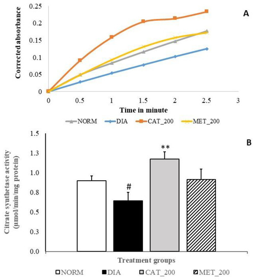 Slope of CS assay indicates the reaction rate of the enzyme. Higher enzyme levels indicate greater slope. Slope of reaction in diabetes control and normal control are 0.05 and 0.07 respectively and diabetes control showed significant (28%; p < 0.05) in CS activity as compared to normal mice. Catalpol treatment showed significant (82%; p < 0.01) improvement CS activity as indicated in higher slope value (0.09) vs. diabetes control and 31% vs. normal control. In contrast, metformin treatment showed a higher reaction rate with a slope value of 0.07 as compared to the diabetes control, CS activity was 41% higher vs. diabetic control, and almost no change versus normal control. The results are depicted in Figure 6A,B.