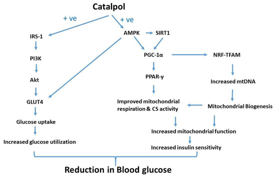 Catalpol treatment to the diabetic mice significantly attenuated the diminished insulin signaling gene expression, mitochondrial respiration and CS activity. Thus, the mitochondrial function is profoundly increased by catalpol which could be mediated through augmentation of insulin signaling and/or AMPK/SIRT1/PGC-1α/PPAR-γ pathway. In contrast, metformin significantly increased p-AMPK and GLUT4 expression without any effect on mitochondrial function in the skeletal muscle. The putative molecular pathway of catalpol is depicted in Figure 7. Based on the observation, catalpol exhibits a potential antidiabetic effect by ameliorating insulin sensitivity, glucose uptake, and mitochondrial function, which needs to be further investigated in a human population.