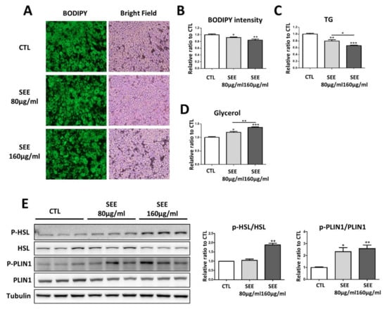 C3H10T1/2 (American Type Culture Collection (ATCC)) cells were cultured in Dulbecco’s Modified Eagle’s Medium (DMEM, Sigma, St. Louis, MO, USA) containing 10% fetal bovine serum (FBS, Gibco Thermo Fisher Scientific, Waltham, MA, USA) and 1% penicillin/streptomycin (Thermo Fisher, Waltham, MA, USA) under standard conditions (37 °C, 5% CO2). Cell culture and adipogenic differentiation were performed as previously described []. As adipocytes were fully differentiated, exposed media were replaced with DMEM containing 10% FBS and incubated overnight, and SEE (80 µg/mL, 160 µg/mL) were treated for 24 h. 4,4-Difluoro-1,3,5,7,8-Pentamethyl-4-Bora-3a,4a-Diaza-s-Indacene (BODIPY 493/503, Invitrogen Thermo Fisher Scientific, Waltham, MA, USA) staining was performed for neutral lipid staining. TG colorimetric assay kit (Cayman Chemical, Ann Arbor, MI, USA) was used to measure intracellular TG contents. Glycerol levels in conditioned media were measured using glycerol reagent (Sigma, St. Louis, MO, USA) according to the manufacturer’s instructions. Red-fluorescent mitochondrion-selective probes MitoTracker Red CMXRos (Thermo Fisher, Waltham, MA, USA) were used to label mitochondrion in live cells.