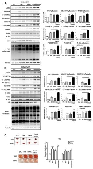 Consistent with data from mice fed normal chow diets, treatment with SEE and EMIQ significantly increased mitochondrial content, and phosphorylation levels of PKA downstream proteins and co-administration showed synergic upregulation in several mitochondrial proteins in BAT and WAT (Figure 5A,B).