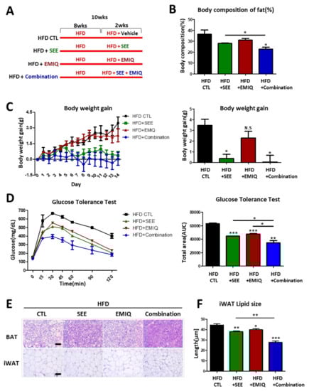 To assess the anti-obesity effects of SEE and EMIQ, we used a high-fat diet(HFD)-induced obesity mouse model. Mice were fed a HFD for 8 weeks and each group was treated with SEE, EMIQ, or a combination of SEE with EMIQ for two weeks, with the continuation of HFD feeding (Figure 4A). After two weeks of treatment, SEE single treatment and combination treatment with EMIQ significantly reduced body fat composition (%) and body weight gain (Figure 4B,C). Similarly, adipocyte diameters in WAT were reduced by SEE single treatment and combination treatment with EMIQ (Figure 4E,F). Glucose tolerance was improved by single and combination treatment (Figure 4D). Combination treatment with SEE and EMIQ showed an additive effect on improved glucose tolerance (Figure 4D).