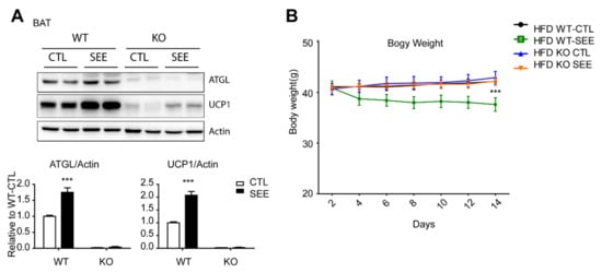 Finally, to determine whether the anti-obesity effect of SEE required activation of cytosolic lipolysis, we used adipocyte-specific adipose triglyceride lipase (ATGL) knockout (KO) mouse models. We used the ATGL KO model as ATGL is the cytosolic lipase that initiates the hydrolysis of TG and its activity is regulated by abhydrolase domain containing 5 (ABHD5) dissociated from PLIN1 by PKA-dependent phosphorylation [] (Figure S6B). ATGL knockout in adipose tissue was confirmed by western blotting (Figure 6A). Although phosphorylation levels of CREB an HSL were not affected by abrogation of ATGL (Figure S6A), ATGL KO reduced UCP1 expression in BAT, consistent with previous studies []. Treatment with SEE did not affect the expression levels of UCP1or reduced body weight (Figure 6A,B). Collectively, these data indicate that activation of cytosolic lipolysis is the major mechanism of the anti-obesity effect of SEE.