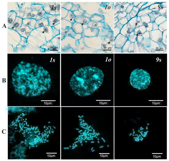 The structure of the interphase nucleus also varied after the establishment of plants into in vitro culture (Figure 2). In the young cell line 9s, the structure of the interphase nuclei did not differ from that of differentiated leaf tissue [], while significant differences were observed in long-term-cultivated lines 1s and 1o (Table 1). In the nuclei of the old lines, a significant increase in the number of nucleoli and the appearance of out-of-the nucleolus genetic material (i.e., micro nucleoli with a size of less than 2 mm) were observed. The total number of nucleoli varied from 1 to 4 in the young culture and from 2 to 21 in old cultures (Figure 1B). The ratio of the average number of macro/micro nucleoli in the nucleus of cell populations in the 1s and 1o lines was 5.6/4.3 and 6.3/5.5, respectively (Table 1). Comparison of the interphase nuclei characteristics and the chromosome number data revealed a significant positive correlation (r = 0.98, p = 0.05) between the mean number of nucleoli in the nucleus and the average number of chromosomes in the cell.