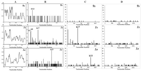 All rDNA alleles in the cell cultures were unique, with one exception (9s). The value of nucleotide diversity (π) for the cell lines 9s, 1s, and 1o were estimated to be 0.00226, 0.00550, and 0.00360, respectively. The distribution patterns of nucleotide diversity, as well as hotspots of variation in the 18S rDNA sequences, were different for each cell line of P. ginseng (Figure 3A,B). In the cell cultures originating from vegetative stem tissue, the main peaks of nucleotide diversity were localized at the beginning of the gene sequences, while in the cultures originated from ovary the most pronounced peak was identified at the end part of gene sequences, within h33. In the short-term-cultivated stem cell line 9s, a single small peak of nucleotide diversity was found within the ES3, while there were three main peaks in the long-term-cultivated stem line 1s within h7, h8, and h17.