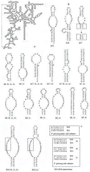 In the 1o cell line, the only alternative structure was identified among the rDNA alleles as in h7 and ES3; all h17 alleles formed a ginseng-specific structure common with that of 1s and 9s, and h8 alleles had two line-specific alternative structures. The ES3 alternative structure differed with a small additional interior loop, and that of h7 had an increased interior loop and a decreased bulge loop. The first alternative configuration of h8 had a shortened apical helix with an increased interior loop, and the second one constituted only a hairpin loop with short helix followed by a vast region of non-pairing nucleotides (Figure 4B,C).