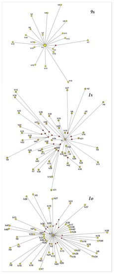 - Bandelt, H.J.; Forster, P.; Röhl, A. Median-joining networks for inferring intraspecific phylogenies. Mol. Biol. Evol. 1999, 16, 37–48. [Google Scholar] [CrossRef]