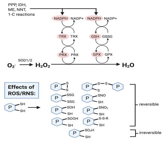 Reactive oxygen species (ROS) removal and effects. NADPH levels are crucial in ROS removal mechanisms and is produced through the pentose phosphate pathway (PPP), isocitrate dehydrogenase (IDH), malic enzyme (ME), nicotinamide nucleotide transhydrogenase (NNT), and one-carbon reactions (e.g., tetrahydrofolate metabolism). NADPH reduces oxidized forms of thioredoxin (TRX) and glutathione (GSSG), and these reduced forms (shown in red) then activate peroxiredoxin (PRX) and glutathione peroxidase (GPX) so that they can reduce H2O2 to water (H2O). ROS (mainly H2O2) and RNS (e.g., nitric oxide) can cause the oxidative modification of protein cysteine thiol residues, most of which are reversible, and serve to protect them from oxidative damage, and to modify protein activity. Refer to text for details.