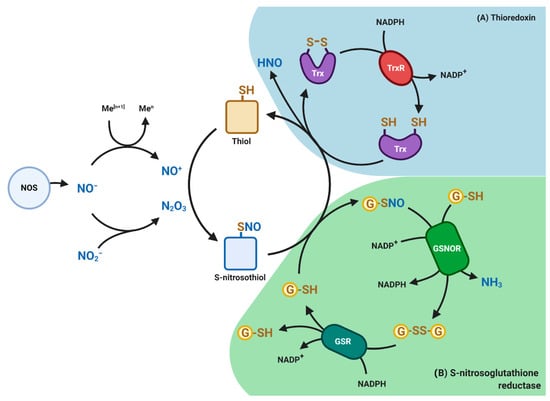 Redox-based post-translational modifications mediated by nitric oxide (NO). Nitric oxide synthases (NOS) generates NO gas which reacts with thiol-containing molecules such as proteins and glutathione (GSH) to form S-nitrosothiols or S-nitrosoglutatione (GSNO), respectively. Shown are (A) Thioredoxin (Trx) pathway (blue) and (B) S-nitrosoglutathione reductase (GSNOR) pathway (green). GSNOR and TR catalyzes the denitrosation of protein nitrosothiols and GSNO. By reducing GSNO to GSSG and NH3, GSNOR indirectly controls the levels of S-nitrosothiols and associated signal transduction. Glutathione (GSSG) is reduced back to GSH by glutathione reductase (GSR) at the expense of NADPH. Similarly, Trx mediates denitrosation of protein nitrosothiols by releasing nitroxyl (HNO) group to form reduced thioredoxin at the expense of NADPH. HNO can diffuse and react in the surrounding environment. An imbalance in NO signaling can promote tumorigenesis and tumor progression.