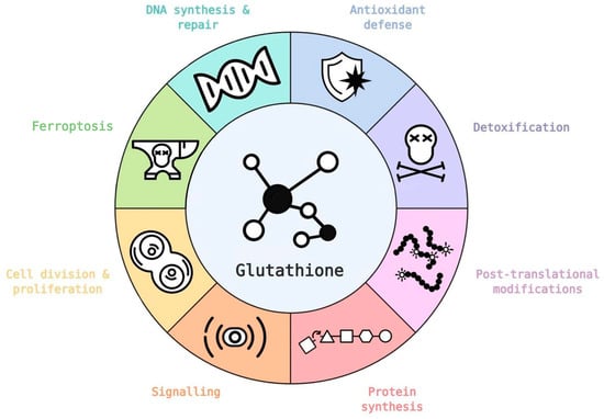 Elevated levels of GSH have been observed in many cancers including breast, ovarian, lung, as well as head and neck cancers [47]. Through its many physiological functions (Figure 4) glutathione has a major role in tumors with a number of publications showing that increased cellular levels of glutathione are necessary for tumor initiation and proliferation [48,49].