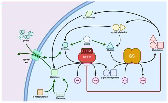 GSH biosynthesis is a well-conserved pathway in which the three precursor amino acids, cysteine, glutamate, and glycine, are combined to form the tripeptide GSH. In animals, this process occurs exclusively in the cytosol, where the two enzymes glutamate cysteine ligase (GCL) and glutathione synthetase (GS) are localized. GCL catalyzes the first, and rate-controlling, step of the pathway that creates a linkage between glutamate and cysteine via the γ-carboxyl residue of the latter to produce γ-glutamylcysteine [56]. ATP hydrolysis and Mg2+ as a cofactor are required to facilitate this reaction. Furthermore, the GCL enzyme is composed of a catalytic and modifier subunit (GCLC and GCLM, respectively); GCLM is subject to feedback inhibition by GSH. The second and final step of the pathway produces GSH via the addition of glycine to the γ-glutamylcysteine intermediate. [57]. Coupled to this is the degradation of GSH to its constituent amino acids, where a γ-glutamyl cyclotransferase enzyme hydrolyzes GSH to produce the intermediates cysteinyl glycine and 5-oxoproline. Cysteinyl glycine is subsequently broken down into cysteine and glycine through cleavage by its respective peptidase, and a 5-oxoprolinase enzyme produces glutamate through ATP hydrolysis [58]. These pathways form the glutathione (also known as γ-glutamyl) cycle, as shown in Figure 5.