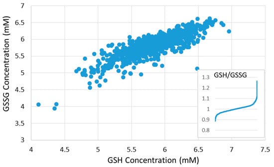 Relative GSH and GSSG concentrations vary slightly across cancer cell lines (data presented by Li et al., [65] and obtained from https://portals.broadinstitute.org/ccle). Figure shows concentration of GSSG as a function of the concentration of GSH in the same cell line (concentrations shown in mM). Insert plot shows differences in the ratio of GSH/GSSG across 928 cell lines.