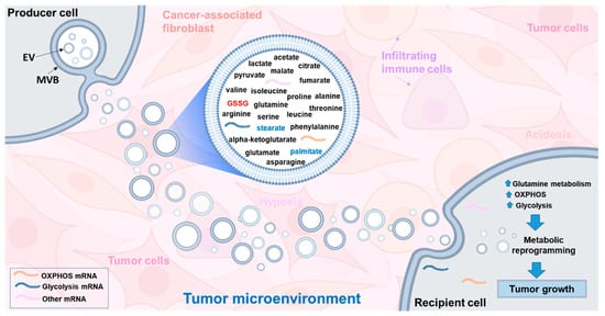 Recent studies have revealed that CAF-derived exosomes in the TME can facilitate communication between tumor and stromal cells and contribute significantly to tumor progression [147,148]. There are only a few studies available on the metabolite composition of exosomes and this area remains largely understudied. CAF-derived exosomes have been shown to contain amino acids, lipids and TCA intermediates that inhibit mitochondrial oxidative phosphorylation, thereby increasing glutamine-dependent reductive carboxylation and promote glycolysis in tumor cells [149]. In addition, CAF-derived exosomes obtained from prostate cancer patients and cultured under in vitro conditions were able to reprogram the metabolic machinery of cancer cells [149]. More recently, EVs derived from glioblastoma (GBM) cells were shown to facilitate transformation of reactive astrocytes and promote tumor growth [150]. GBM-EVs were internalized by reactive astrocytes and appeared to reprogram astrocyte metabolism by delivering mRNAs for glycolytic enzymes (enolase 1, hexokinase-1, and hexokinase-2) and oxidative phosphorylation (cytochrome c oxidase) to activate the biosynthetic processes needed for tumor growth [150]. Taken together, these studies provide support for the role of EVs in metabolic reprogramming and alteration of the TME to promote tumor growth (Figure 7).