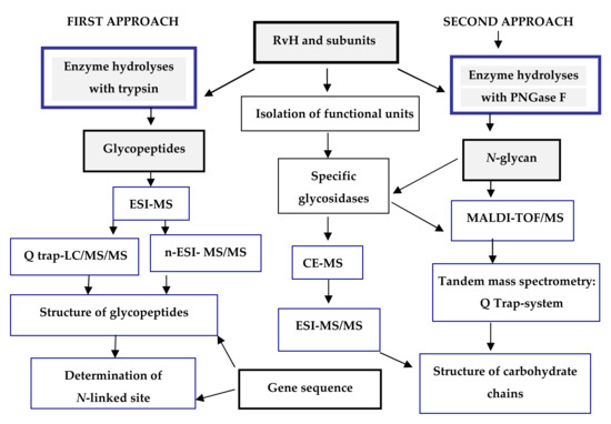 In the first approach, functional units (FUs) of the two subunits RvH1 and RvH2 are treated with trypsin and the obtained glycopeptides are identified through LC/ESI-MS, LC-Q-trap-MS/MS or nano-ESI-MS [28,29,30,31,32,33]. The second approach includes isolation of glycans after hydrolysis of the subunits of RvH with specific glycosidases (PNGase F) and analysis of the glycan structures with MALDI-TOF-MS, СЕ-MS, and Q-trap instrumental systems [28,29,34].