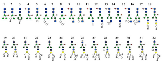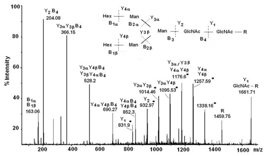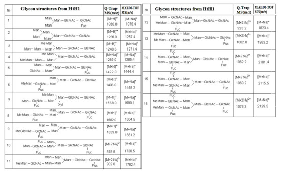 The large set of ions in the MS/MS spectrum determines the structure of the glycan, the positions of two Fuc residues in the said chains, and one bound Fuc(α1-6) residue to the pentasaccharide core in the glycan. On the basis of the obtained data, a conclusion about the wide variety of structures of the 15 N-linked glycans of HtH1 was made (Figure 13).