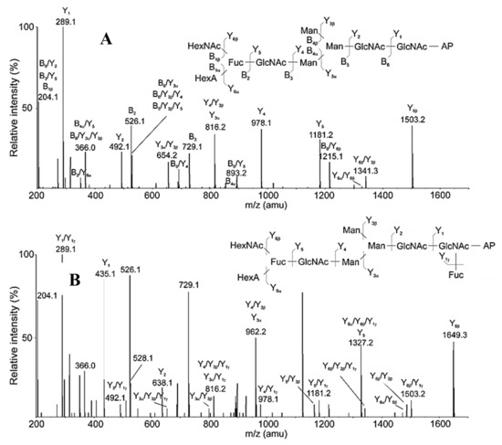 Another important piece of information is the structural differences of glycans with identical isomer MS/MS spectra, which is probably due to the acid tetrasaccharide attached to the α-1,3 or α-1,6-arm positions of the trimannose core. Proof for this is the reported difference from the additional Fuc residue in the MS/MS spectra of the ion with m/z 853.7 [M+2H]2+ (Figure 8A) and with m/z 926.8 [M+2H]2+ (Figure 8B).