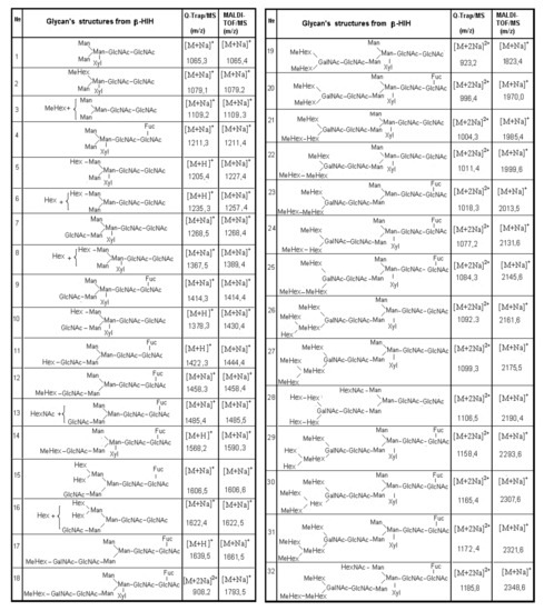 Further interesting carbohydrate structures are also presented in RvH1 and RvH2 by Q-trap analyses of the obtained glycans after treatment of both subunits with PNGase F glycosidase, specific for N-glycosylation. This approach proved to be very suitable for determination of the structures of 25 glycans from RvH1 and 28 glycans from RvH2. Glycan structures with one HexNAc residue and HexA bound in an oligosaccharide of RvH to an internal Fuc residue have been demonstrated [32,33].