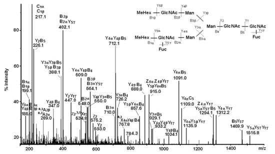 MS/MS spectrum of HtH1 glycan represented by ion with m/z 1002.8 [M+2Na]2+ and complex carbohydrate structure [40].