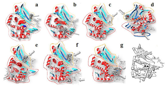3D-models of FU from «a“ to «g“ of HtH1 and potential N-linked sites, depicted on the basis of the structure of OdH-g. β-sandwich domain (yellow); α-nucleus (red); N-glycolised site (grey). The glycans are marked with arrows [40].