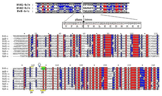 - Altenhein, B.; Markl, J.; Lieb, B. Gene structure and hemocyaninisoform HtH2 from the mollusc Haliotis tuberculata indicate early and late intron hot spots. Gene 2002, 301, 53–60. [Google Scholar] [CrossRef]
