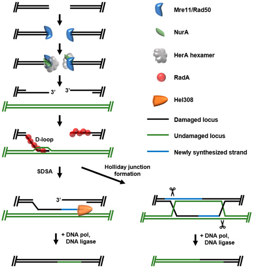 - Delmas, S.; Shunburne, L.; Ngo, H.-P.; Allers, T. Mre11-Rad50 Promotes Rapid Repair of DNA Damage in the Polyploid Archaeon Haloferax volcanii by Restraining Homologous Recombination. PLoS Genet. 2009, 5, e1000552. [Google Scholar] [CrossRef] [PubMed]