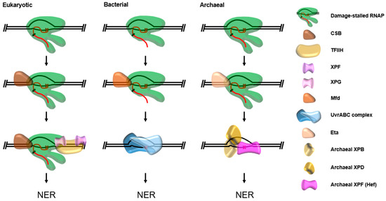 - Deaconescu, A.M.; Sevostyanova, A.; Artsimovitch, I.; Grigorieff, N. Nucleotide excision repair (NER) machinery recruitment by the transcription-repair coupling factor involves unmasking of a conserved intramolecular interface. Proc. Natl. Acad. Sci. USA 2012, 109, 3353–3358. [Google Scholar] [CrossRef] [PubMed]