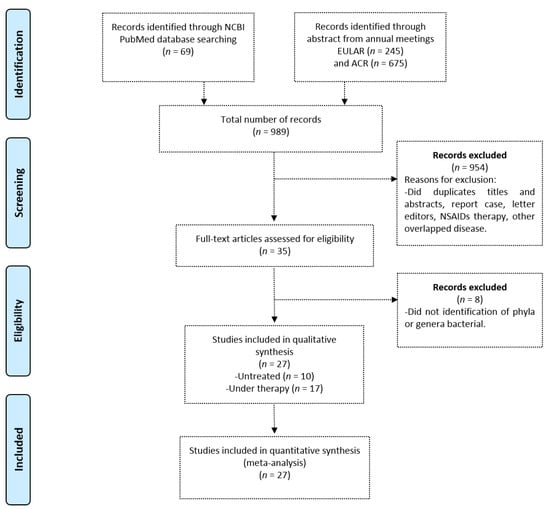 The inclusion criteria were as follows: studies in patients with RA in pre-clinical phases, early RA, with or without pharmacological treatment regardless of the administered therapeutic schemes; and studies of in vivo and in vitro models; cross-sectional studies; case-control studies; and cohort studies. The review included studies based on conventional methodologies such as bacterial culture, analysis of qPCR, pyrosequencing, 16s rRNA, and bacterial metagenome (Figure 1).