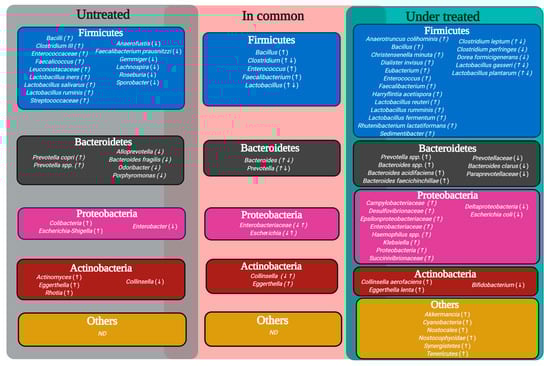 Variability in the gut microbiota in RA under treated and untreated with DMARDs. Genera colors represent phylum and ↑/↓, increased/decreased status in patients with rheumatoid arthritis untreated or under treated. DMARDs, disease-modifying antirheumatic drugs; RA, rheumatoid arthritis; ND, non-describable.