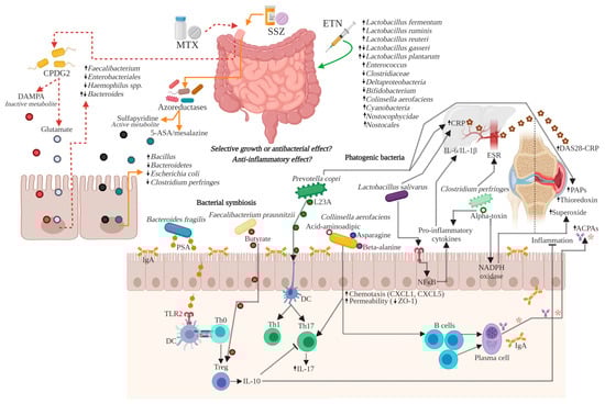 In RA patients, it has been proven that the combined treatment of boDMARDs and MTX or with SSZ is associated with the decrease in families Prevotellaceae and Paraprevotellaceae in gut microbiota []. However, the sole therapy of csDMARDs has proven its relation with the increase in Prevotella spp.’s abundance [], but also with the decrease in the proportion of Prevotella/Bacteroides fragilis []. The complexity in the analysis of microbial species that are possibly related to pharmacological metabolism indicates that the bacteria establish metabolic pathways that converge in mediating a key spot of pharmacological transformation, bioavailability, and absorption.