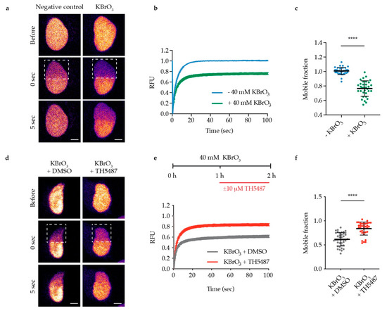 Live cell imaging and FRAP assays in U2OS cells show that upon TH5487 treatment, OGG1 is more mobile (Figure 2d–f), indicating that OGG1 binding to damaged chromatin is impaired. This affirms the observed phenotype in A3 cells, where TH5487 was found to alter OGG1–chromatin dynamics [14]. The increased mobility of OGG1 excludes any entrapment of OGG1 on damaged DNA after OGG1 inhibition. This is in agreement with an almost complete lack of detectable OGG1 retention in pre-extracted cells treated with both KBrO3 and TH5487 (Figure 3). Importantly, the observed impaired OGG1–chromatin binding, together with the previously reported in vitro electrophoretic mobility shift assay (EMSA) results, support our conclusion that TH5487 hampers OGG1 binding to damaged DNA. Besides, it complements the reported crystal structure of mouse OGG1 in complex with one analogue of TH5487 confirming targeting of OGG1′s active site [14]. The recently resolved crystal structure of human OGG1 in complex with TH5487 further confirms that TH5487 targets the active site of human OGG1. OGG1 adopts a closed conformation upon binding to TH5487, which blocks OGG1′s access to its substrate DNA lesions [32]. This explains the increased mobility of OGG1 upon TH5487 treatment (Figure 2d–f).