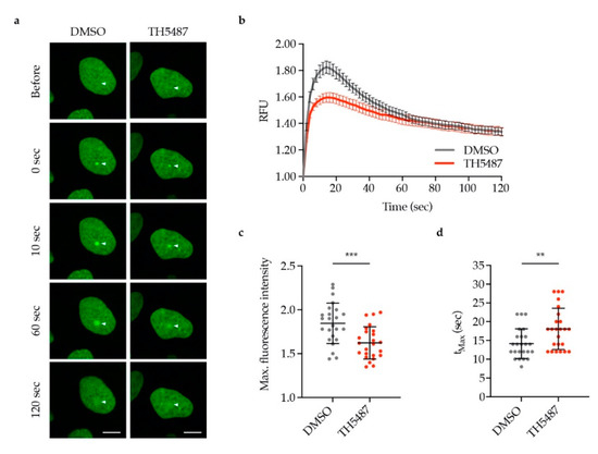 To investigate whether the reduced OGG1–chromatin binding observed in TH5487-treated cells was caused by lower recruitment or faster dissociation of OGG1, we monitored OGG1-GFP recruitment to laser-induced DNA damage sites. OGG1-GFP recruitment kinetics were found to be impaired in TH5487-treated cells exemplified by recruitment of less OGG1-GFP (Figure 4a–c) and the longer time needed for the fluorescence intensity to reach its maximum level (Figure 4d).