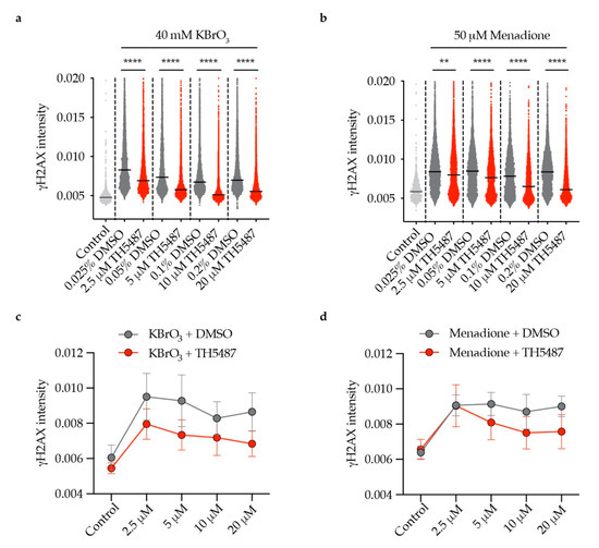 Excision of 8-oxoG lesions by OGG1 can result in the generation of DNA single-strand breaks (SSBs) [19]. Near-simultaneous attempted base excision repair (BER) of clustered oxidative lesions on opposing strands may generate double-strand breaks (DSBs) [20,21,22]. We sought to study whether TH5487 treatment impairs OGG1′s incision activity in cells, affecting DNA break generation. U2OS cells expressing OGG1-GFP were co-treated with oxidizing agents, KBrO3 or menadione and increasing concentrations of TH5487 or equivalent amount of DMSO. Both oxidizing agents have been reported to induce oxidative stress, generating 8-oxoG lesions [16,17,23]. Quantitative microcopy revealed that γH2AX formation is significantly reduced in a dose-dependent manner by TH5487 (Figure 5). This indicates that TH5487 not only prevents the binding of OGG1 to damaged DNA, but also inhibits its catalytic function in cells, leading to fewer incisions and thus fewer breaks.