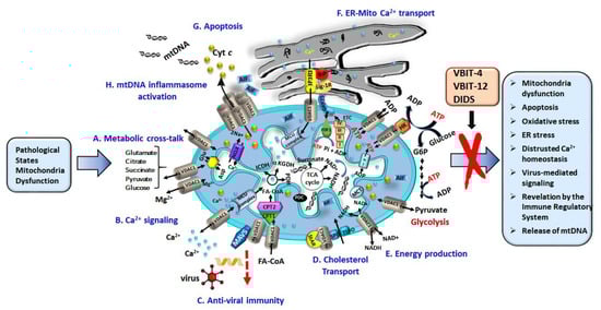 Voltage-dependent anion channel 1 (VDAC1) as a multi-functional channel mediates metabolites, nucleotides, and Ca2+ transport, controlling energy production, endoplasmic reticulum (ER)-mitochondria cross-talk, and apoptosis. VDAC1 is responsible for a number of functions in the cell and mitochondria including: (A) transfer of metabolites between the mitochondria and cytosol; (B) passage of Ca2+ to and from the intermembrane space (IMS) to facilitate Ca2+ signaling; (C) Mitochondrial antiviral-signaling protein (MAVS) associated with VDAC1 enable anti-viral signaling. (D) Transfer of acetyl coenzyme-A (acyl-CoAs) across the outer mitochondrial membrane (OMM) to the IMS, for conversion into acylcarnitine by CPT1a for further processing by β-oxidation. Together with Star and translocator protein (TSPO), VDAC1 forms the multi-protein transduceosome, which transports cholesterol. (E) Recycling ATP/ADP, NAD+/NADH, and acyl-CoA between the cytosol and the IMS, and regulating glycolysis via association with HK; (F) contributing to ER-mitochondria contacts, where Ca2+ released by IP3 activation of inositol 1,4,5-trisphosphate receptors (IP3R) in the ER is directly transferred to IMS via VDAC1, and then is transported to the matrix by the Ca2+ uniporter (MCU complex). In the matrix Ca2+ regulates energy production via activation of the tricarboxylic acid cycle (TCA) cycle enzymes: pyruvate dehydrogenase (PDH), isocitrate dehydrogenase (ICDH), and α-ketoglutarate dehydrogenase (α-KGDH). The electron transport chain (ETC) and the ATP synthase (FoF1) are also presented. (G) VDAC1 oligomers forming a hydrophilic protein-conducting channel capable of mediating the release of apoptogenic proteins (e.g., Cyto c and apoptosis-inducing factor (AIF)) from the mitochondrial IMS to the cytosol, leading to apoptosis. (H). VDAC1 oligomers allow mtDNA release triggering inflammasome activation. Pathological conations lead to dysfunction of the mitochondria as reflected in the activities presented in the box on the right. These altered activities can be prevented by VDAC1-interacting molecules, such as DIDS, VBIT-4 and VBIT-12.
