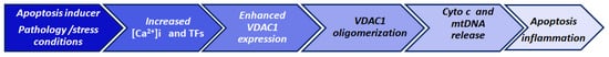 The mechanism for up-regulation of the expression of VDAC1 is thought to involve an increase in the intracellular concentration of ionized calcium ([Ca2+]i), [,,,]. Increasing the [Ca2+]i directly by the addition of A23187, ionomycin, or thapsigargin also upregulated VDAC1 expression, and promoted oligomerization, and apoptosis [,,]. As a corollary, chelating Ca2+ with BAPTA-AM and thereby reducing [Ca2+]i, inhibited the overexpression and oligomerization of VDAC1, and subsequent apoptosis. This process of overexpression of VDAC1 induced by apoptosis stimuli, stress conditions, and pathological conditions leading to oligomerization and triggering apoptosis [,] is presented in Figure 2.