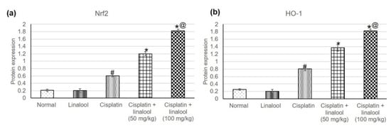 Effects of pre-treatment with linalool (50 and 100 mg/kg) for 14 days on the Nrf2/HO-1 signaling pathway in cisplatin-induced acute kidney injury: (a) Nrf2 and (b) HO-1 levels. All values are expressed as mean ± SD. #, statistically significant from normal group, *, statistically significant from cisplatin-only group, @, statistically significant from cisplatin + linalool 50 mg/kg group (p < 0.05) using one-way ANOVA followed by Tukey’s post-hoc analysis.