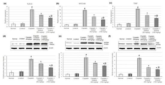 Effects of pre-treatment with linalool (50 and 100 mg/kg) for 14 days on the TLR pathway gene expression (mRNA amplification) (a) TLR4, (b) MyD88, and (c) TRIF, and TLR pathway proteins’ expression (d) TLR4, (e) MYD88, and (f) TRIF in cisplatin-induced acute kidney injury. All values are expressed as mean ± SD. # indicates statistically significant compared with the normal control group, * indicates statistically significant from the cisplatin-only group, and @ indicates statistically significant from the cisplatin + linalool 50 mg/kg group (p < 0.05) using one-way ANOVA followed by Tukey’s post-hoc analysis.