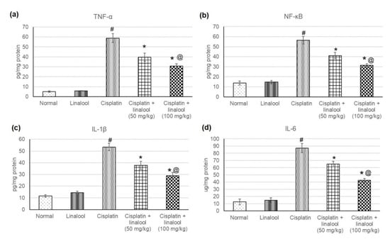 Effects of pre-treatment with linalool (50 and 100 mg/kg) for 14 days on the inflammatory mediators (a) TNF-α, (b) NF-κB, (c) IL-1β, and (d) IL-6 in cisplatin-induced acute kidney injury. All values are expressed as mean ± SD. # indicates statistically significant from normal control group, * indicates statistically significant from cisplatin-only group, and @ indicates statistically significant from cisplatin + linalool 50 mg/kg group (p < 0.05) using one-way ANOVA followed by Tukey’s post-hoc test.