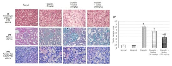 Histopathological analysis showing the protective effect of linalool (50 and 100 mg/kg) on the kidney tissues challenged through cisplatin injection: representative photomicrographs of (I) hematoxylin and eosin (H&E) staining, (II) Masson staining, and (III) periodic acid Schiff (PAS) staining, and (IV) quantitative assessment of tubular damage score. All values are expressed as mean ± SD. # indicates statistically significant from the normal control group, * denotes statistically significant from the cisplatin-only group, @ indicates statistically significant from the cisplatin + linalool 50 mg/kg group (p < 0.05) using one-way ANOVA followed by Tukey’s post-hoc test. Renal injury was scored based on the proportion of damaged tubules in the kidney sample where 0 = normal kidney (no damage), 1 = minimal damage (less than 25% damage), 2 = mild damage (25–50% damage), 3 = moderate damage (50–75% damage), and 4 = severe damage (> 75% damage).