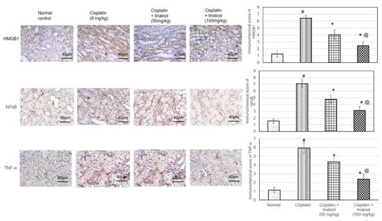 Immunohistochemical staining of renal tissues with HMBG1, NF-κB, and TNF-α antibodies after cisplatin induction of kidney injury. Pre-treatment with linalool (50 and 100 mg/kg) for 14 days diminished the number of positive cells containing HMBG1, NF-κB, and TNF-α. All values are expressed as mean ± SD (n = 3). # denotes statistically significant from the normal control group, * indicates statistically significant from the cisplatin-only group, and @ represents statistically significant from the cisplatin + linalool 50 mg/kg group (p < 0.05) using one-way ANOVA followed by Tukey’s post-hoc test.