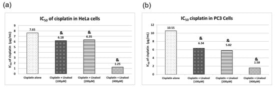 Cytotoxicity actions of c isplatin alone or in combination with different concentrations of linalool in HeLa (a) and PC3 (b) cancer cell lines. All values are expressed as mean ± SD. All values are expressed as mean ± SD. The symbol “&” indicates statistically significant from cisplatin-only group (p < 0.05) using one-way ANOVA followed by Tukey’s post-hoc test.