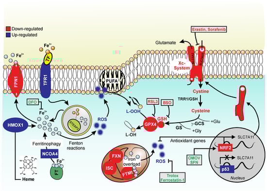 Ferroptotic markers in Friedreich’s ataxia. The figure recapitulates the hallmarks of ferroptosis that are also characteristic of FRDA. Down-regulated factors are represented in red, while up-regulated factors are represented in blue. The figure shows reactive oxygen species (ROS) overproduction due to different causes. FXN-deficiency leads to accumulation of free iron that is not correctly bound by storage systems, such as FTMt and iron-sulfur clusters (ISC) at the mitochondrial level. Moreover, the free iron pool increases due to: augmented activity of heme oxygenase-1 (HMOX-1), which releases free iron from heme degradation; up-regulation of NCOA4, which is involved in ferritinophagy; augmented levels of transferrin receptor 1 (TFR1), which imports iron into the cell; and to insufficient iron export through ferroportin (FPN1). Free iron participates in Fenton reactions and ROS are overproduced causing oxidative stress. Upon FXN deficiency, a reduction in the Xc (SLC7A11/SLC3A2)-system-mediated cystine import also occurs, likely due to increase of P53 and decrease of NRF2 activity that represses and induces SLC7A11 transcription, respectively. This leads to the lowering of intracellular cysteine pool, thus decreasing GSH synthesis and glutathione peroxidase 4 (GPX4) activity. An overproduction of harmful lipid peroxides (LOOH) is elicited, that further contribute to ROS overproduction. Finally, the level of Nuclear factor erythroid 2-related factor 2 (NRF2), the main transcription factor involved in the expression of antioxidant genes with a strong anti-ferroptotic potential, results reduced. Ferroptosis inducers: RSL3, GPX4 inhibitor; BSO (L-buthionine sulfoximine), GSH synthesis inhibitor; erastin and sorafenib, Xc system inhibitors. Ferroptosis inhibitors: Deferoxamine (DFO), iron chelator; Trolox and Ferrostatin 1, ROS inhibitors; SFN (sulforaphane) and OMOV (omaveloxolone), NRF2 inducers.