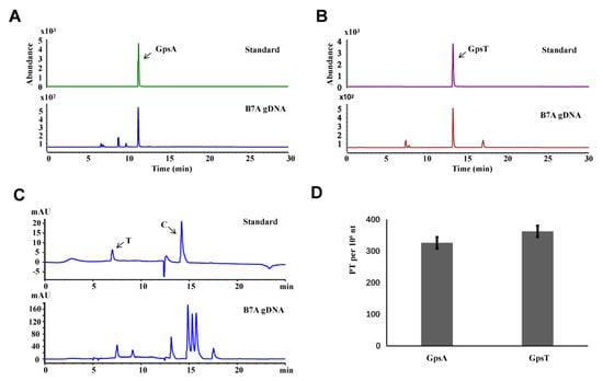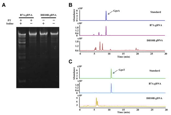 The results demonstrated that iodine could cleave PT-modified DNA with high efficiency. This finding was consistent with the previous cleavage studies [20,21,22,23], so this assay is feasible to detect the presence of PT modifications in the genome. To consolidate the above results, we re-analyzed PT modifications in gDNA of E. coli B7A by LC-MS/MS. As shown in Figure 2B,C, the PT-containing dinucleotides (GpsA or GpsT) after hydrolysis of the gDNA by nucleases is consistent with the retention time of the standard that possessed PT modifications with Rp configuration. These results confirmed that the ICA approach could rapidly detect PT modification status in the genome.