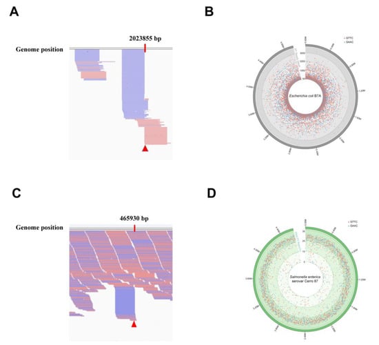The ICDS method was used to characterize the PT-modified on the gDNA isolated from E. coli B7A, which was tested as an example. By aligning the output reads to the reference genome sequence and visual analysis using the IGV, the partial data were visually depicted in Figure 4A, and the GAAC/GTTC sites in E. coli B7A genome were defined as PT-modified sites, with their reads above 50 with the unique tag and ending at this site (such as the red triangle mark in Figure 4A).