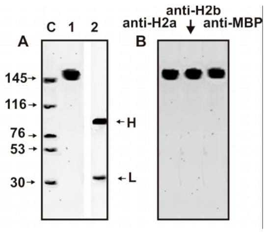SDS-PAGE analysis of enzymatic cross-reactivity of IgGs against MBP, H2a, and H2b was performed using MBP preparation incubation with anti-MBP, anti-H2a, and H2b IgGs.